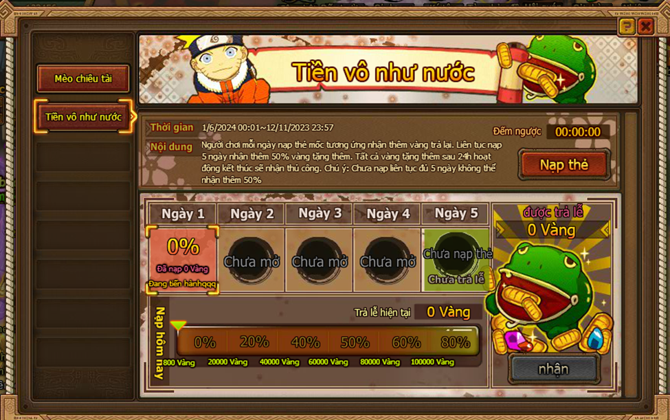 1. Người chơi mỗi ngày nạp thẻ mốc tương ứng nhận thêm vàng trả lại. Liên tục nạp 5 ngày nhận thêm 80% vàng tặng thêm. Tất cả vàng tặng thêm sau 24h hoạt động kết thúc sẽ nhận thủ công. Chú ý: Chưa nạp liên tục đủ 5 ngày không thể nhận thêm 80%.