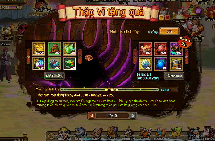 1. Hoạt động có 10 mục, cần tích lũy nạp thẻ để kích hoạt.