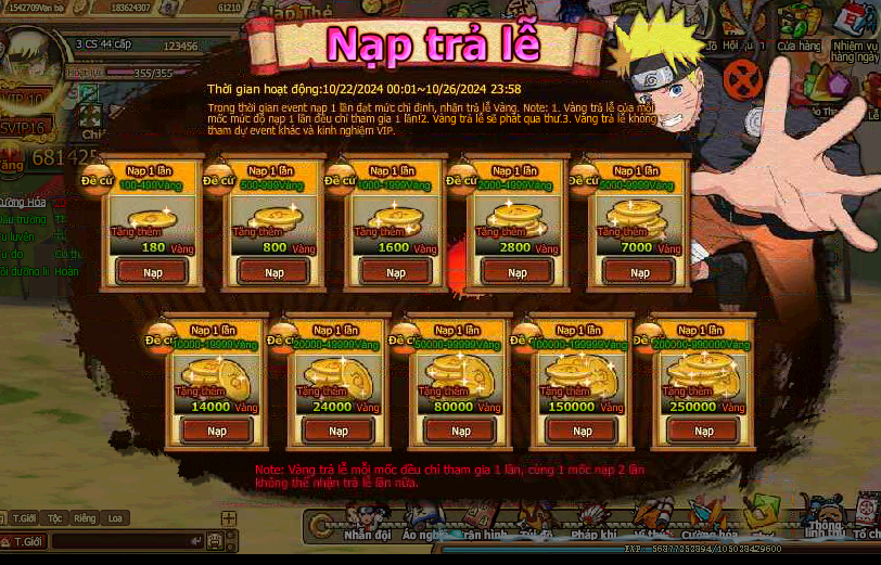 Trong thời gian event nạp 1 lần đạt mức chỉ định , nhận trả lễ vàng