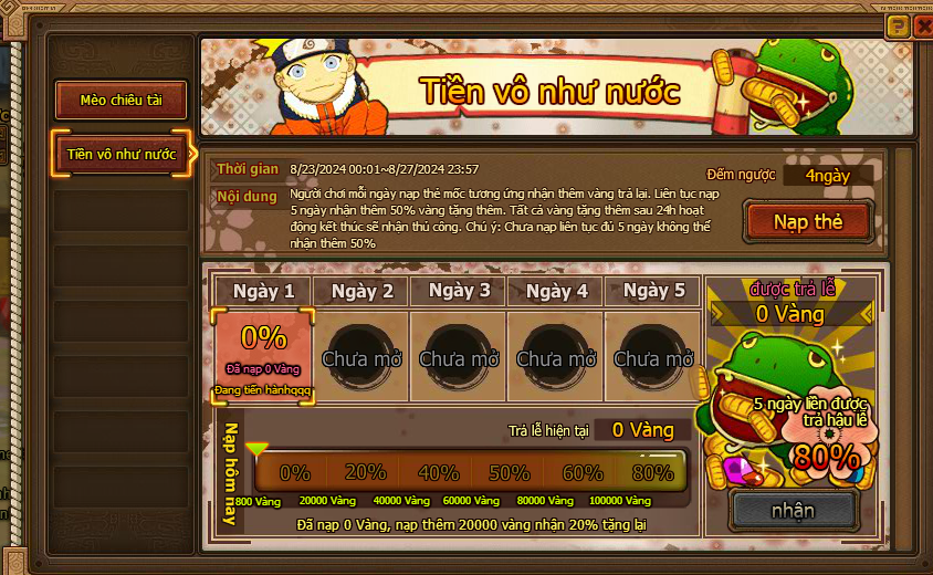1. Người chơi mỗi ngày nạp thẻ mốc tương ứng nhận thêm vàng trả lại. Liên tục nạp 5 ngày nhận thêm 80% vàng tặng thêm. Tất cả vàng tặng thêm sau 24h hoạt động kết thúc sẽ nhận thủ công. Chú ý: Chưa nạp liên tục đủ 5 ngày không thể nhận thêm 80%.