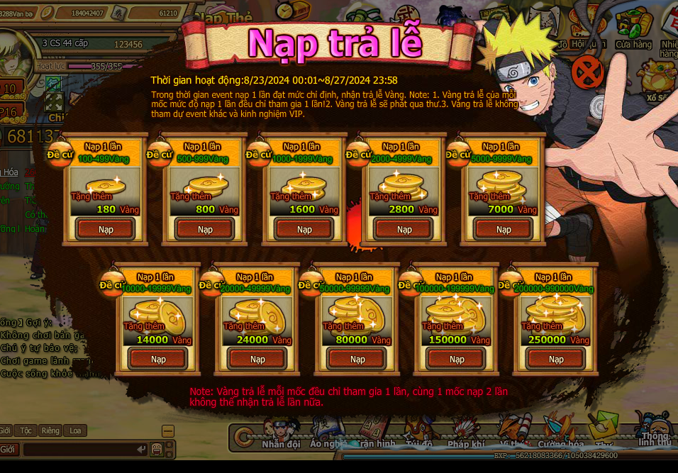 Trong thời gian event nạp 1 lần đạt mức chỉ định , nhận trả lễ vàng