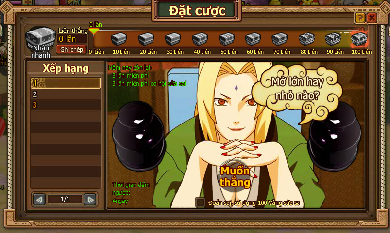 2. Thi đấu bắt đầu khi người chơi điểm số mình lớn hơn hay nhở hơn điểm của Tsunade, nhấn vào nút Lớn hoặc Nhỏ.