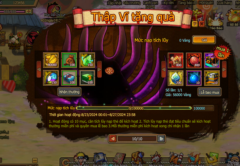 2. Sau khi nạp đủ mốc tương ứng, nhận thưởng Tộc Otsutsuki, nếu chưa nhận thưởng, không thể tăng số lượng Huyết Kế.