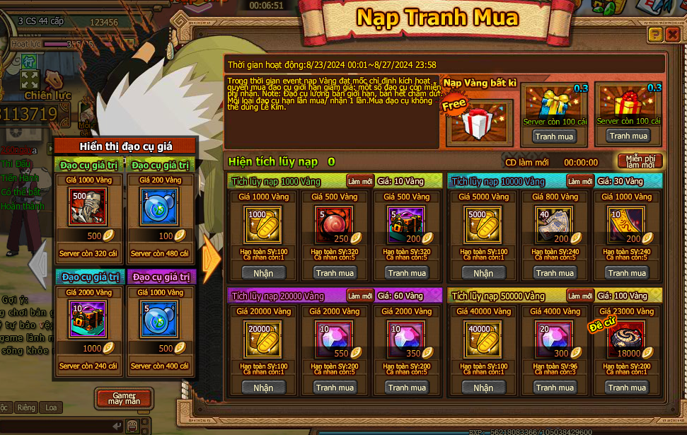 1. Trong thời gian event nạp Vàng đạt mốc chỉ định kích hoạt quyền mua đạo cụ giới hạn giảm giá: một số đạo cụ còn miễn phí nhận.