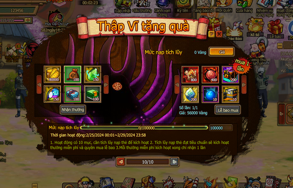 1. Hoạt động có 10 mục, cần tích lũy nạp thẻ để kích hoạt.