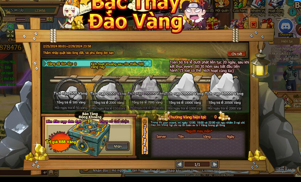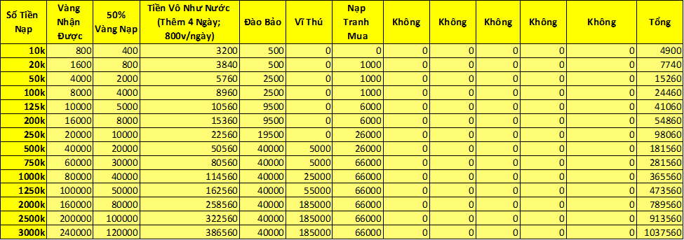 5. Trong thời gian event , nạp 1 lần đầu tiên thỏa nhận thêm bảo tàng khoáng . Trong thời gian , thống kê mức nạp của người chơi toan sv đến giải thưởng may mắn , Mổi nạp 1 Vàng giải thưởng tăng 1 Vàng , mỗi ngày 12:00, 18:00, 22:00 rút ngẫu nhiên 3 người chơi may mắn trong người chơi nạp thẻ toàn sv trả lễ Vàng