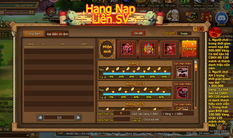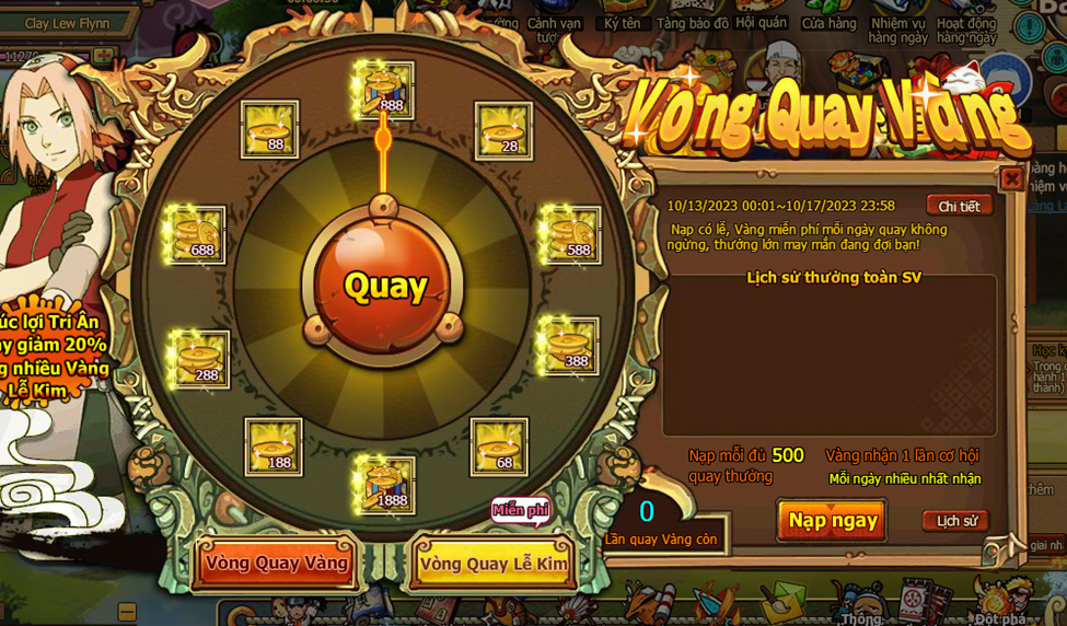 1. Trong thời gian event , người chơi nạp đủ 500 vàng nhận 1 lần cơ hội quay (vòng quay vàng)