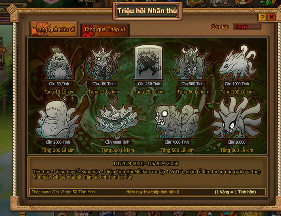 4. Tiêu hao 1 vàng/ lễ kim nhận tinh hồn , thu thập đủ điều kiện nhận rương quà qua thư