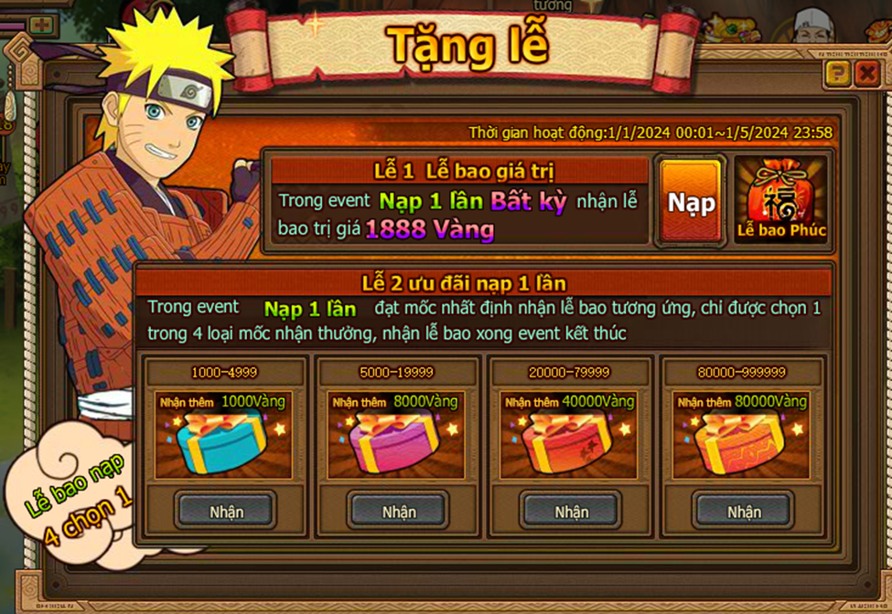 Trong sự kiện này, Nạp Đơn đạt mốc nhất định nhận lễ bao tương ứng, chỉ được chọn 1 trong 4 loại mốc nhận thưởng, nhận lễ bao xong sự kiện kết thúc.