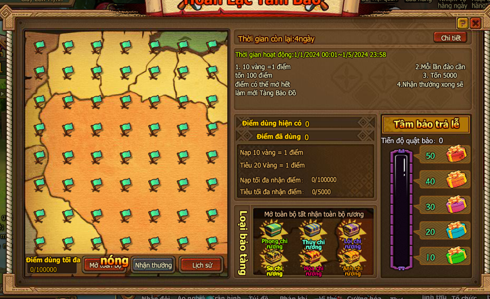 Trong thời gian hoạt động, người chơi online nhận cơ hội rút thưởng may mắn miễn phí, và có thể tiêu hao vàng và lễ kim rút thưởng. Mỗi lần rút thưởng vàng nhận 1 điểm tích lũy. Điểm Tích Lũy dùng để vật phẩm quý. Mỗi lần rút thưởng được 5 điểm may mắn. Đủ 100 điểm may mắn sẽ có 1 cơ hội quay Mật Bảo