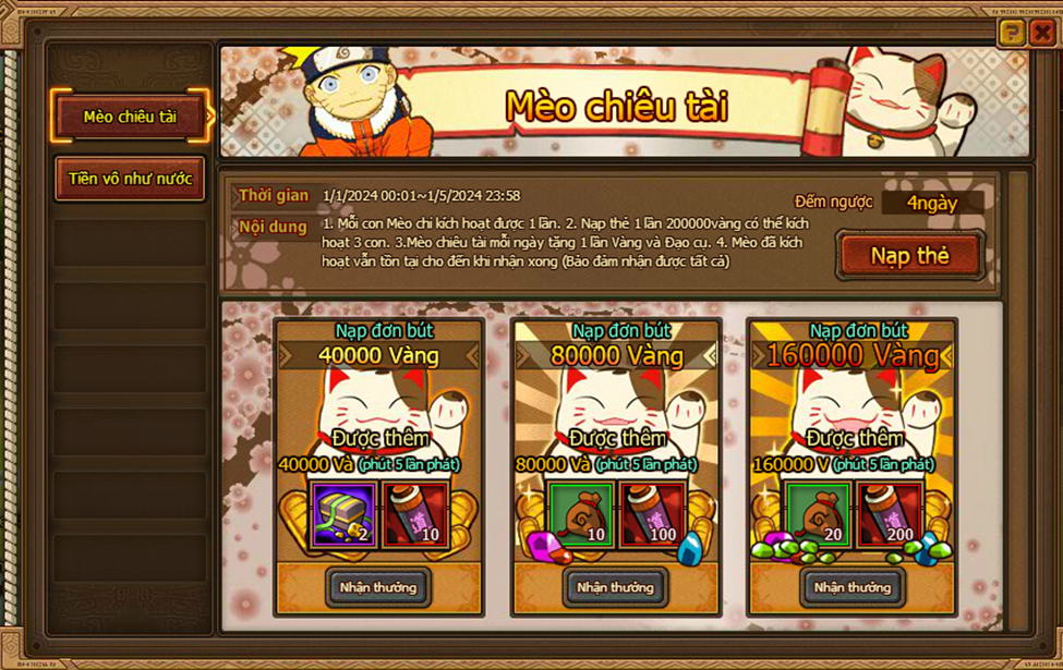 3. Mèo chiêu tài mỗi ngày tặng 1 lần Vàng và đạo cụ.