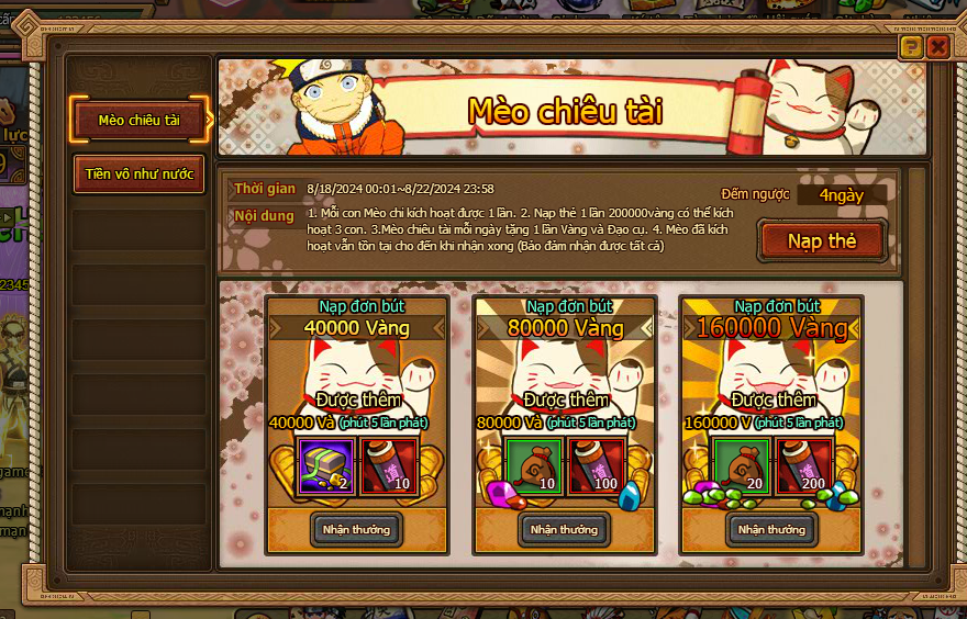 3. Mèo chiêu tài mỗi ngày tặng 1 lần Vàng và đạo cụ.