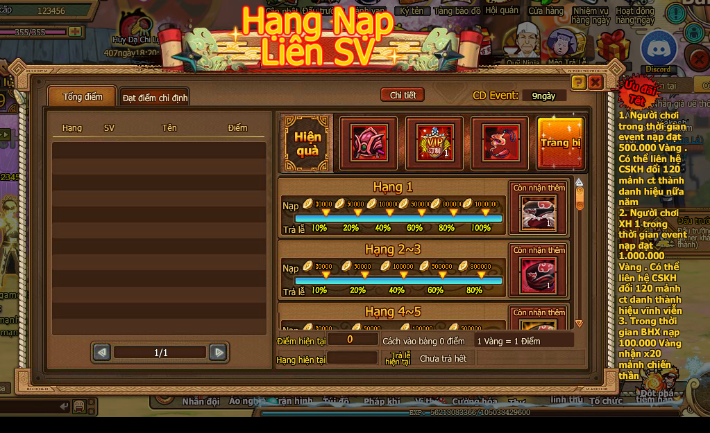 4. Người chơi toan sever nạp đạt 500v ưu đãi 1% , ưu đãi nhiều nhất 80%