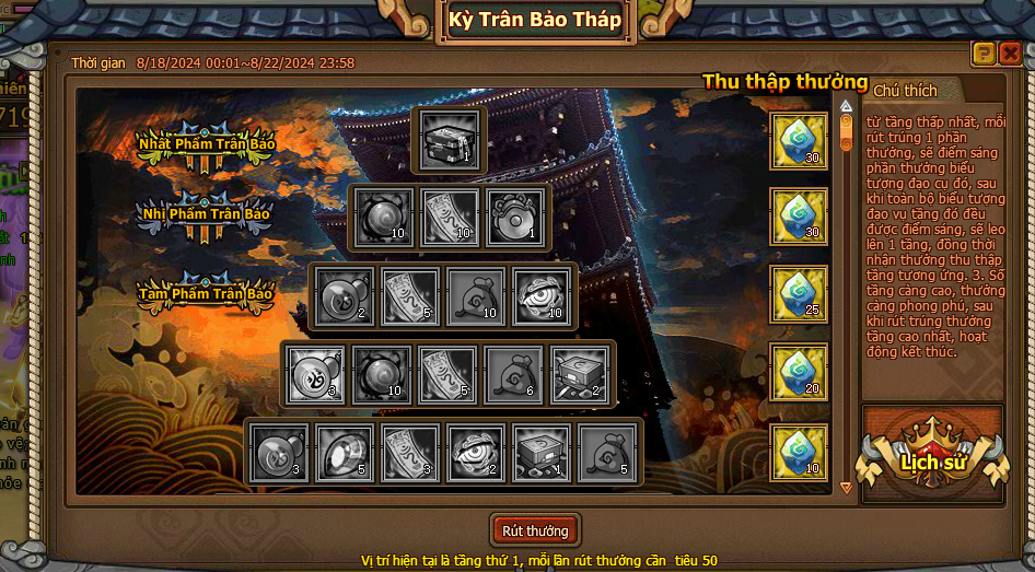 1. Từ tầng thấp nhất, mỗi rút trúng 1 phần thưởng, sẽ điểm sáng phần thưởng biểu tượng đạo cụ đó đều được điểm sáng, sẽ leo lên 1 tầng, đồng thời nhận thưởng thu thập tầng tương ứng.
