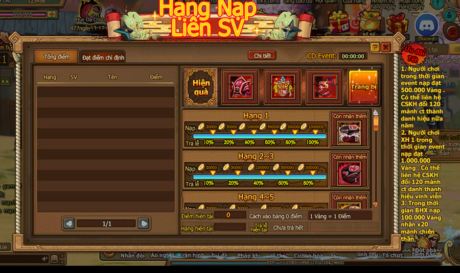 1. Người chơi XH 2 & 3 trong thời gian event nạp đạt 500.000 Vàng . Có thể liên hệ CSKH đổi 120 mảnh ct thành danh hiệu nữa năm ( Danh Hiệu Sáng Chế )