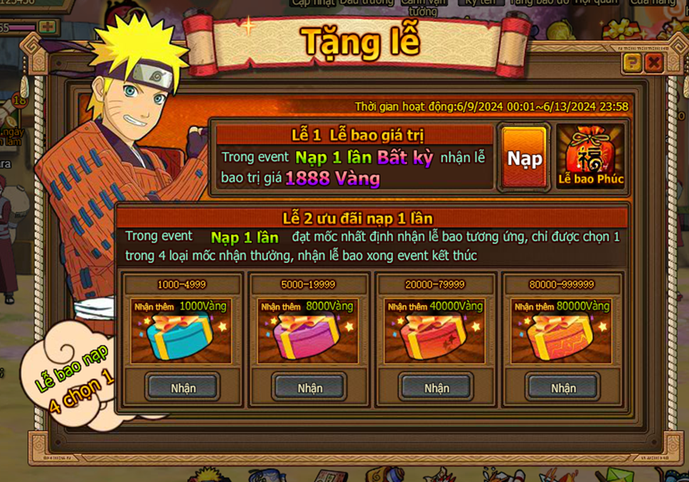 Trong sự kiện này, Nạp Đơn đạt mốc nhất định nhận lễ bao tương ứng, chỉ được chọn 1 trong 4 loại mốc nhận thưởng, nhận lễ bao xong sự kiện kết thúc.