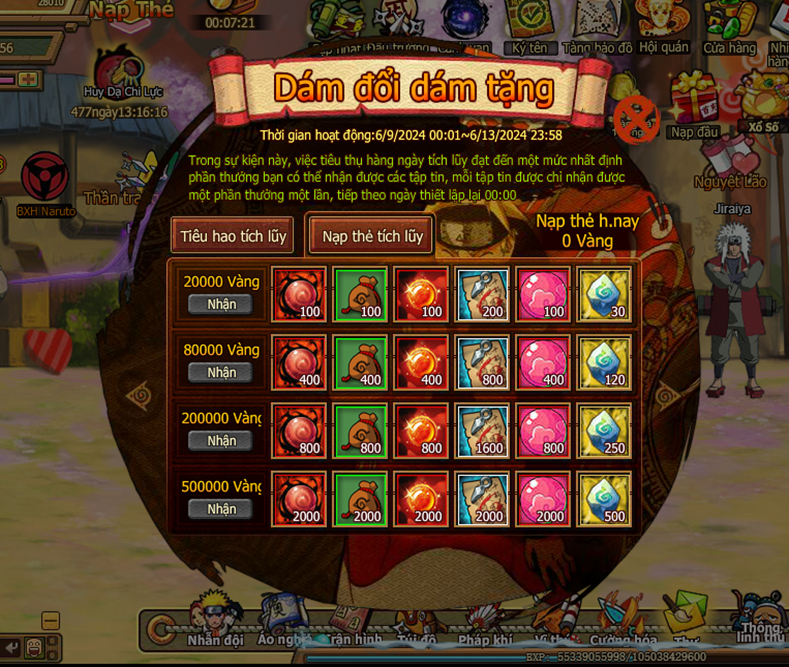2. Người chơi XH 1 trong thời gian event nạp đạt 1.000.000 Vàng . Có thể liên hệ CSKH đổi 120 mảnh ct danh thành hiệu vĩnh viễn ( Danh Hiệu Sáng Chế )