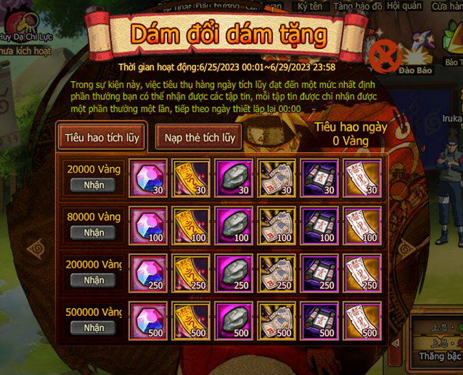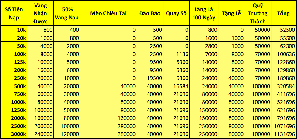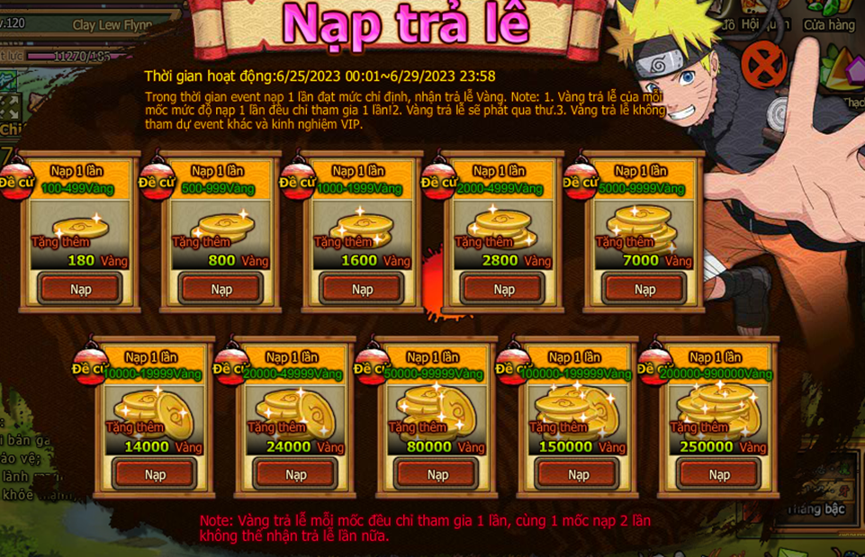Trong thời gian event nạp 1 lần đạt mức chỉ định , nhận trả lễ vàng.