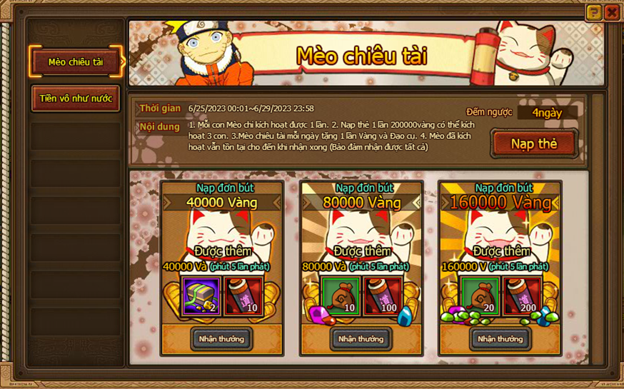 3. Mèo chiêu tài mỗi ngày tặng 1 lần Vàng và đạo cụ.