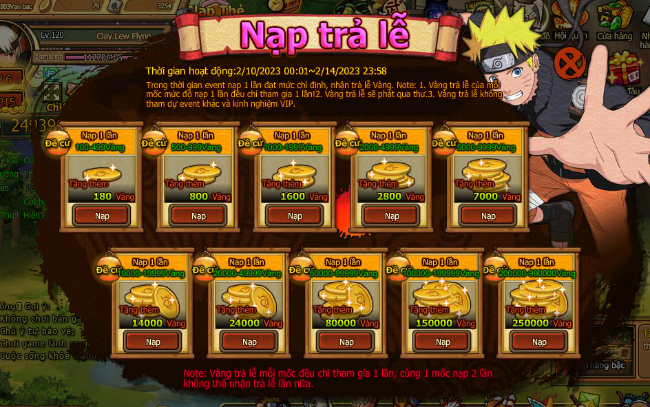 Vàng trả lễ của mỗi mốc mức độ nạp 1 lần đều chỉ tham gia 1 lần