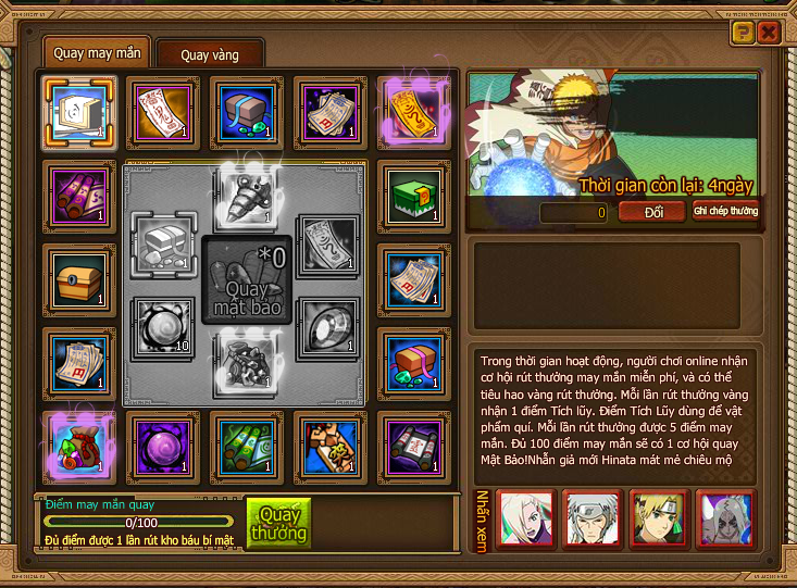 Trong thời gian hoạt động, người chơi online nhận cơ hội rút thưởng may mắn miễn phí, và có thể tiêu hao vàng và lễ kim rút thưởng. Mỗi lần rút thưởng vàng nhận 1 điểm tích lũy. Điểm Tích Lũy dùng để vật phẩm quý. Mỗi lần rút thưởng được 5 điểm may mắn. Đủ 100 điểm may mắn sẽ có 1 cơ hội quay Mật Bảo