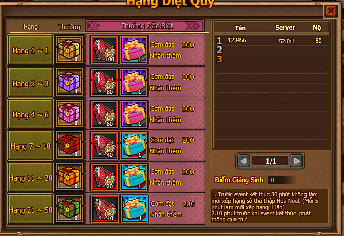 1. Mỗi nạp 800 Vàng có thể nhận được 1 Tất Giáng Sinh