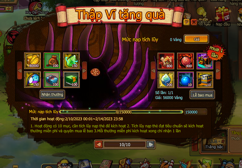 1. Hoạt động có 10 mục, cần tích lũy nạp thẻ để kích hoạt.