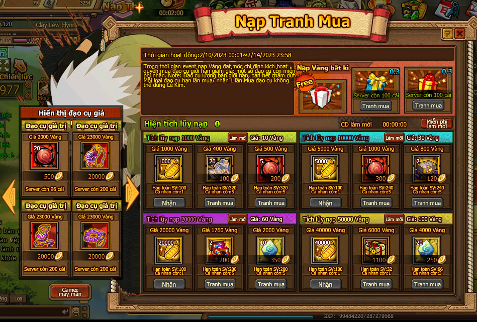 1. Trong thời gian event nạp Vàng đạt mốc chỉ định kích hoạt quyền mua đạo cụ giới hạn giảm giá: một số đạo cụ còn miễn phí nhận.