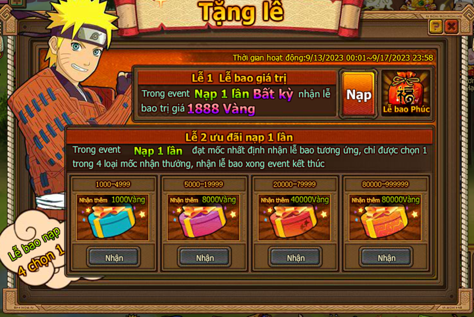Trong thời gian event nạp 1 lần đạt mức chỉ định , nhận trả lễ vàng .