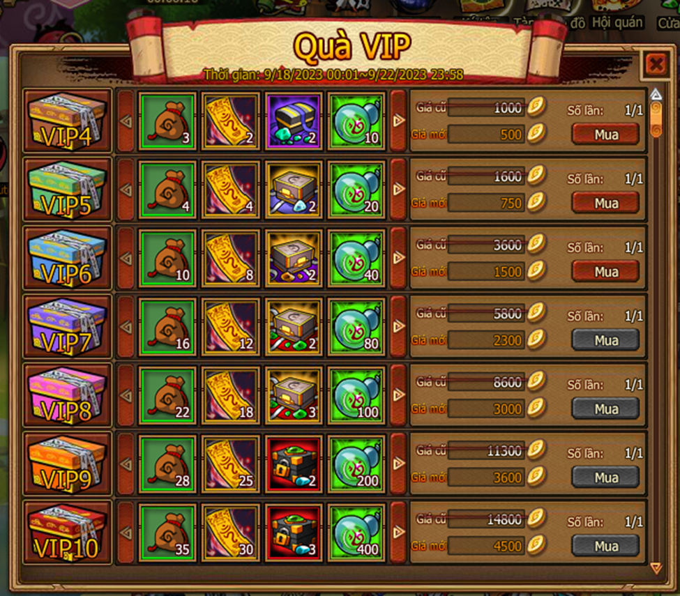 Cấp vip tương ứng sẽ được mua , mua bằng vàng hoặc lễ kim