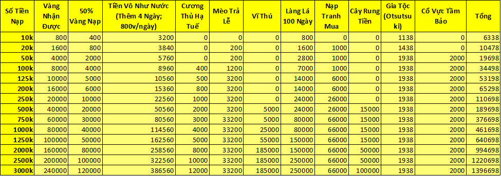Trong thời gian event nạp 1 lần đạt mức chỉ định , nhận trả lễ vàng .