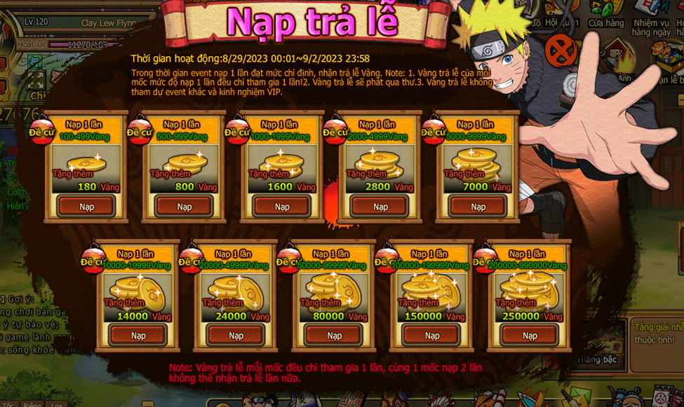 Trong thời gian event nạp 1 lần đạt mức chỉ định, nhận trả lễ vàng