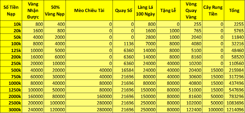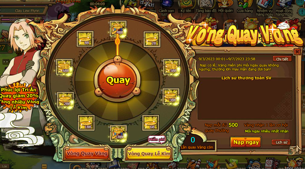 1. Trong thời gian event , người chơi nạp đủ 500 vàng nhận 1 lần cơ hội quay (vòng quay vàng)