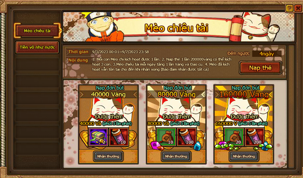 3. Mèo chiêu tài mỗi ngày tặng 1 lần Vàng và đạo cụ.