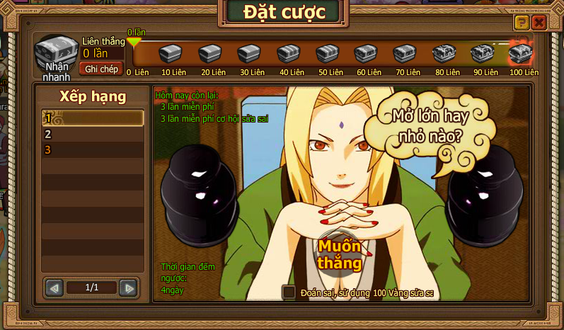 1.Thi đấu bắt đầu khi người chơi điểm số mình lớn hơn hay nhỏ hơn điểm của Tsunade, nhấn vào nút Lớn hoặc Nhỏ