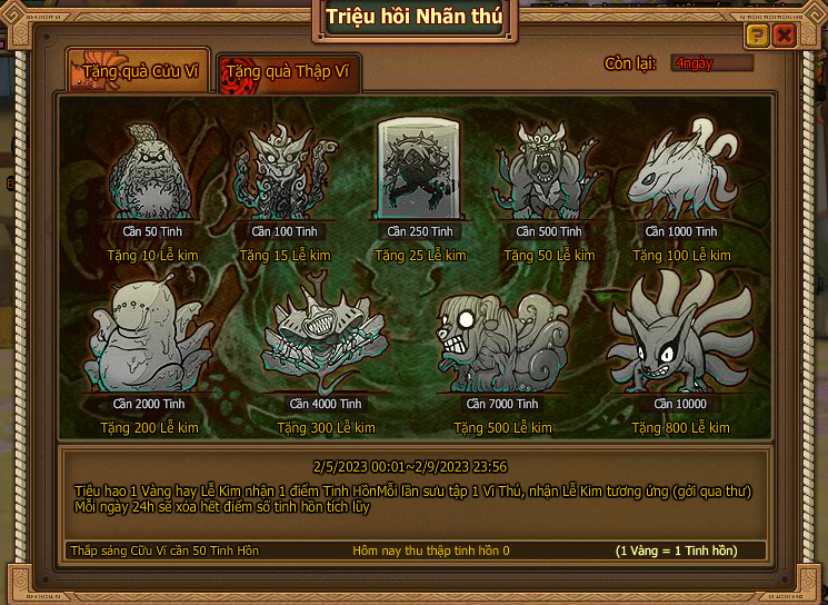 4. Tiêu hao 1 vàng/ lễ kim nhận tinh hồn , thu thập đủ điều kiện nhận rương quà qua thư