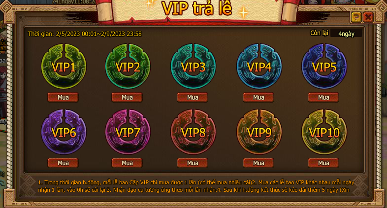 1. Trong thời gian hoạt động, mỗi lễ bao Cấp VIP chỉ mua được một lần (có thể mua nhiều cái)