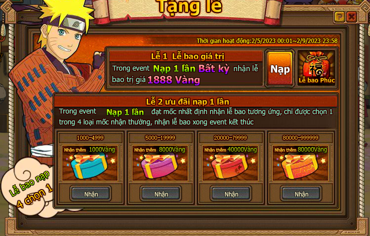 Trong sự kiện này, Nạp Đơn đạt mốc nhất định nhận lễ bao tương ứng, chỉ được chọn 1 trong 4 loại mốc nhận thưởng, nhận lễ bao xong sự kiện kết thúc.