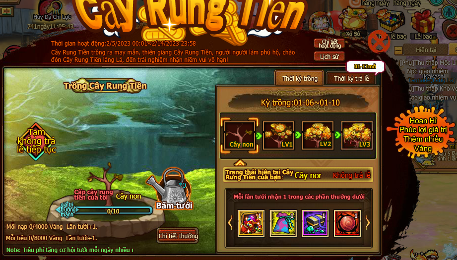 5. Người chơi tiêu 2000 vàng, kích hoạt quỹ giá trị, nhận 20 lần Vàng và đạo cụ trả lễ. Trả lễ qua thư, sau khi kích hoạt nhận ngay lần trả lễ đầu tiên, 19 lần còn lại mỗi ngày 0:30 phát qua thư.