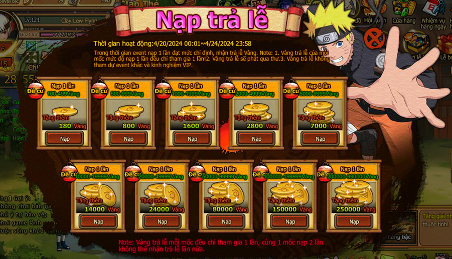 Trong thời gian event nạp 1 lần đạt mức chỉ định , nhận trả lễ vàng
