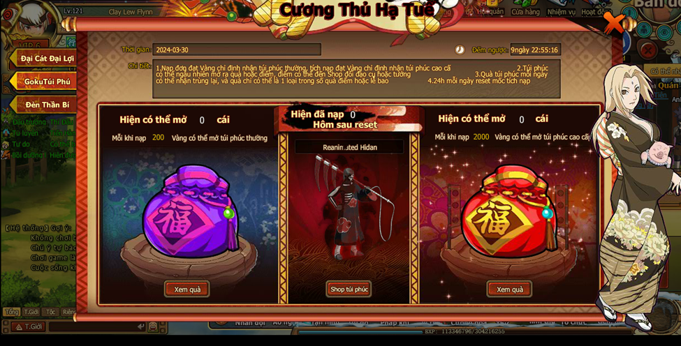 2. Sau khi nạp đủ mốc tương ứng, nhận thưởng Tộc Otsutsuki, nếu chưa nhận thưởng, không thể tăng số lượng Huyết Kế.
