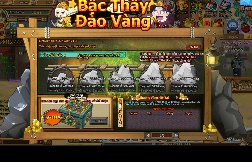 5. Trong thời gian event , nạp 1 lần đầu tiên thỏa nhận thêm bảo tàng khoáng . Trong thời gian , thống kê mức nạp của người chơi toan sv đến giải thưởng may mắn , Mổi nạp 1 Vàng giải thưởng tăng 1 Vàng , mỗi ngày 12:00, 18:00, 22:00 rút ngẫu nhiên 3 người chơi may mắn trong người chơi nạp thẻ toàn sv trả lễ Vàng