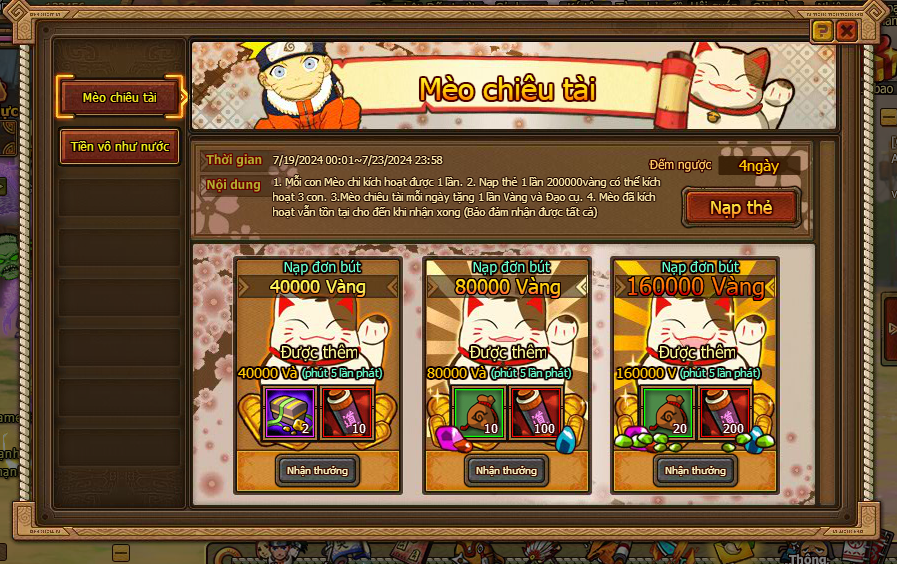 3. Mèo chiêu tài mỗi ngày tặng 1 lần Vàng và đạo cụ.