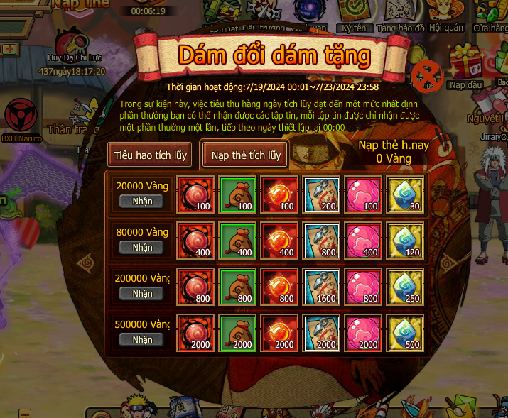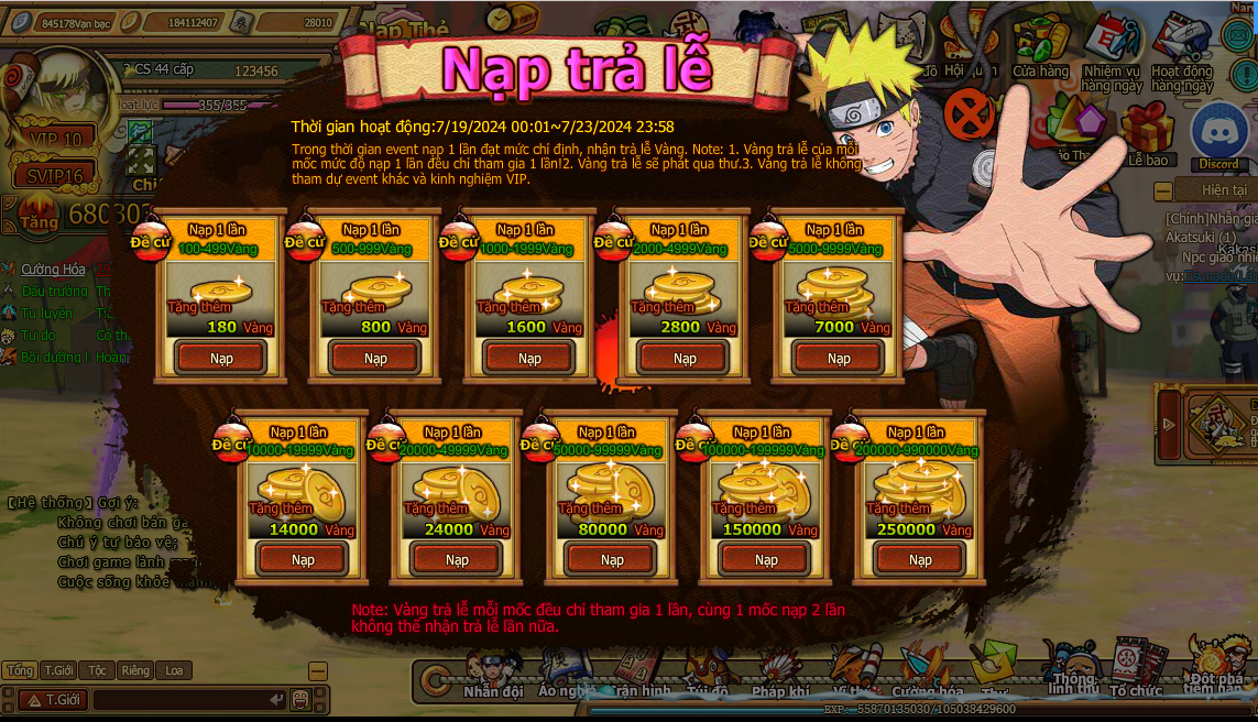 Trong thời gian event nạp 1 lần đạt mức chỉ định , nhận trả lễ vàng
