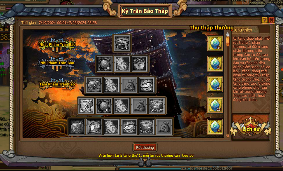 1. Từ tầng thấp nhất, mỗi rút trúng 1 phần thưởng, sẽ điểm sáng phần thưởng biểu tượng đạo cụ đó đều được điểm sáng, sẽ leo lên 1 tầng, đồng thời nhận thưởng thu thập tầng tương ứng.