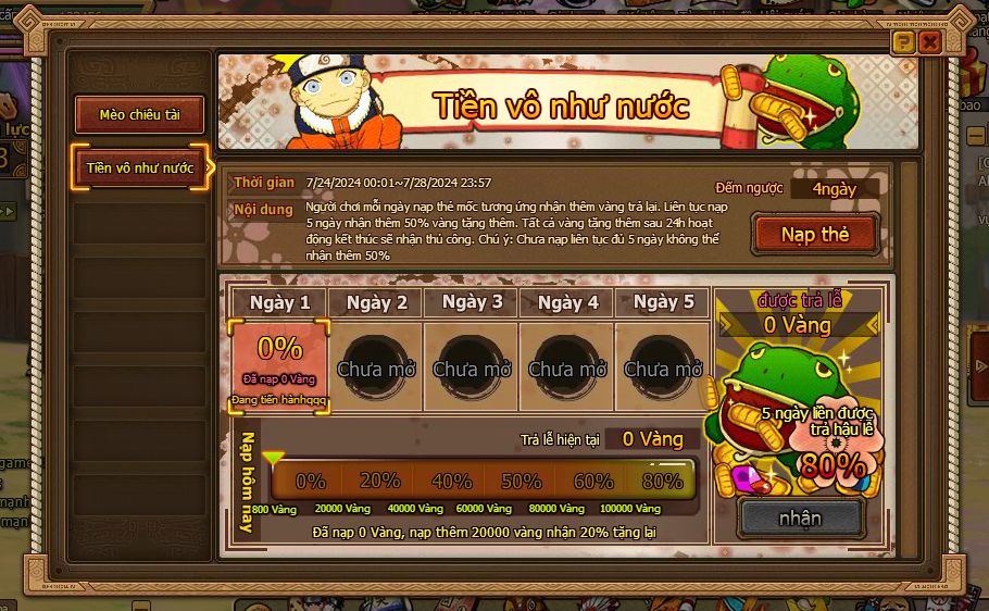 1. Người chơi mỗi ngày nạp thẻ mốc tương ứng nhận thêm vàng trả lại. Liên tục nạp 5 ngày nhận thêm 80% vàng tặng thêm. Tất cả vàng tặng thêm sau 24h hoạt động kết thúc sẽ nhận thủ công. Chú ý: Chưa nạp liên tục đủ 5 ngày không thể nhận thêm 80%.