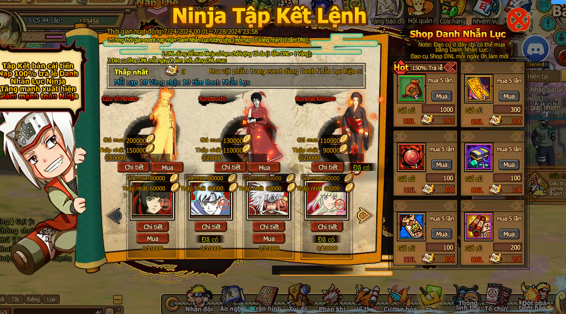 1. Trong thời gian hoạt động mỗi ngày tích lũy nạp đủ mốc tương ứng, mở 4 đại gia tộc, nhận thưởng Huyết kế tương ứng. 4 đại gia tộc gồm: Tộc Hyuga, Tộc Uzumaki, Tộc Uchiha, Tộc Senju.