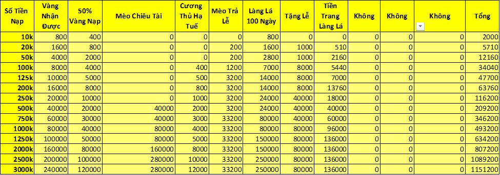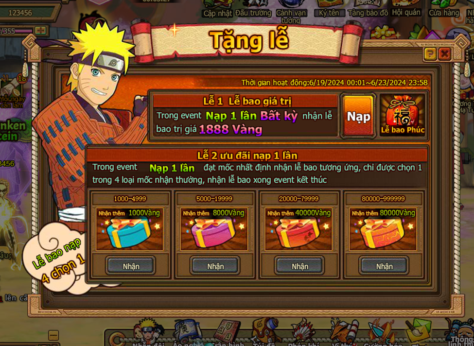 Trong thời gian event nạp 1 lần đạt mức chỉ định , nhận trả lễ vàng