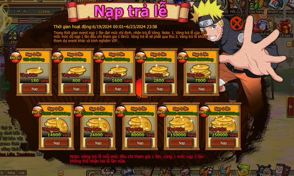 Vàng trả lễ của mỗi mốc mức độ nạp 1 lần đều chỉ tham gia 1 lần
