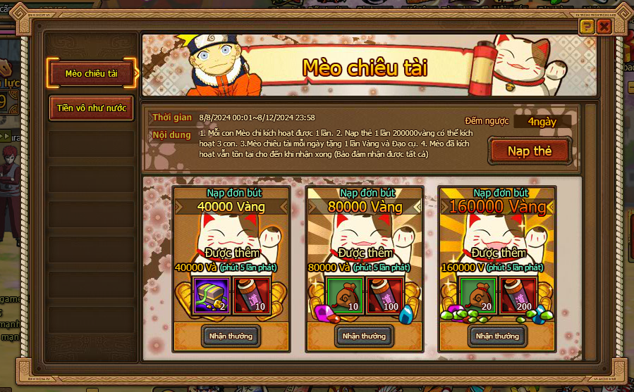 Lưu Ý : nạp 1 lần 200.000 vàng mới nhận cả 3 con mèo